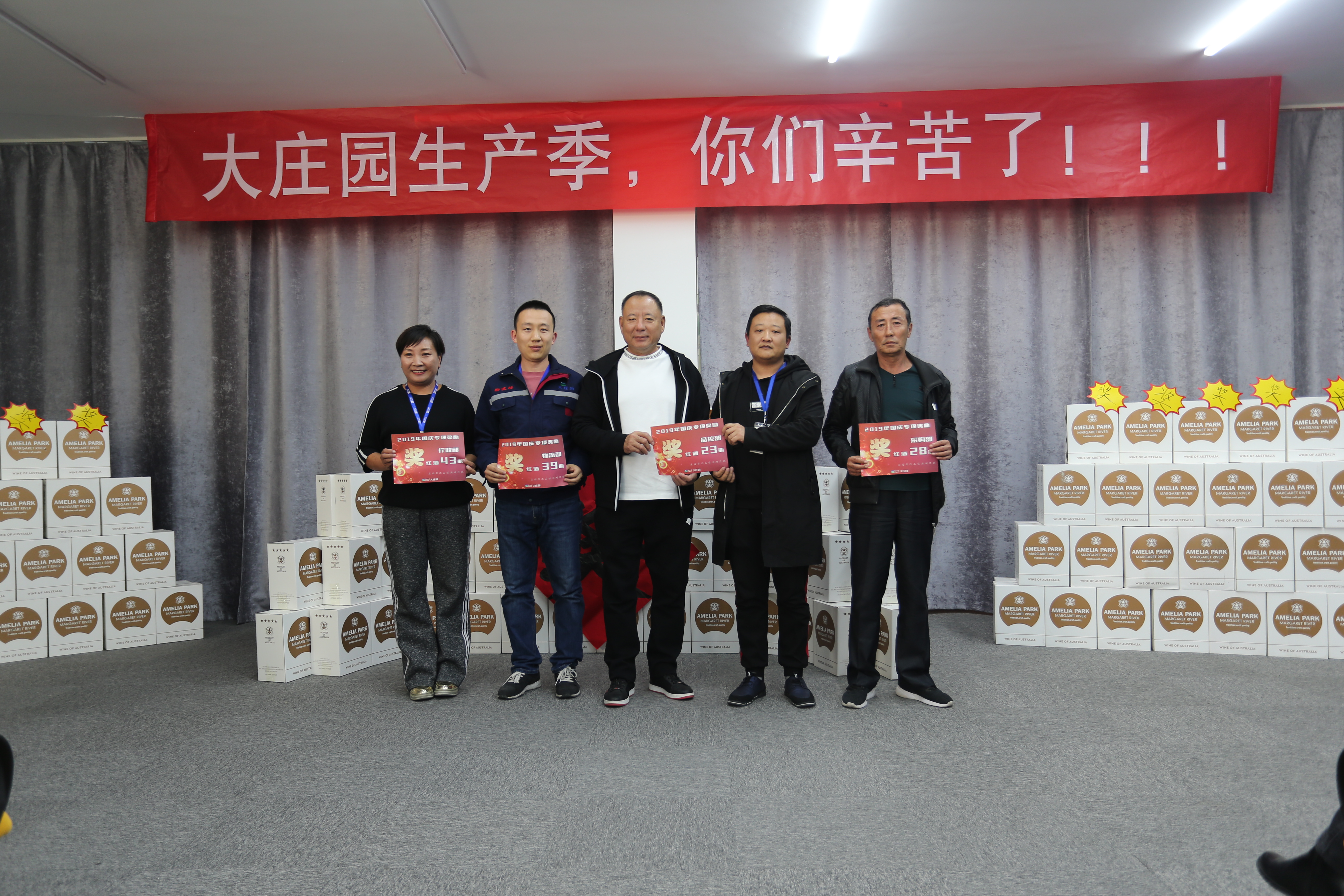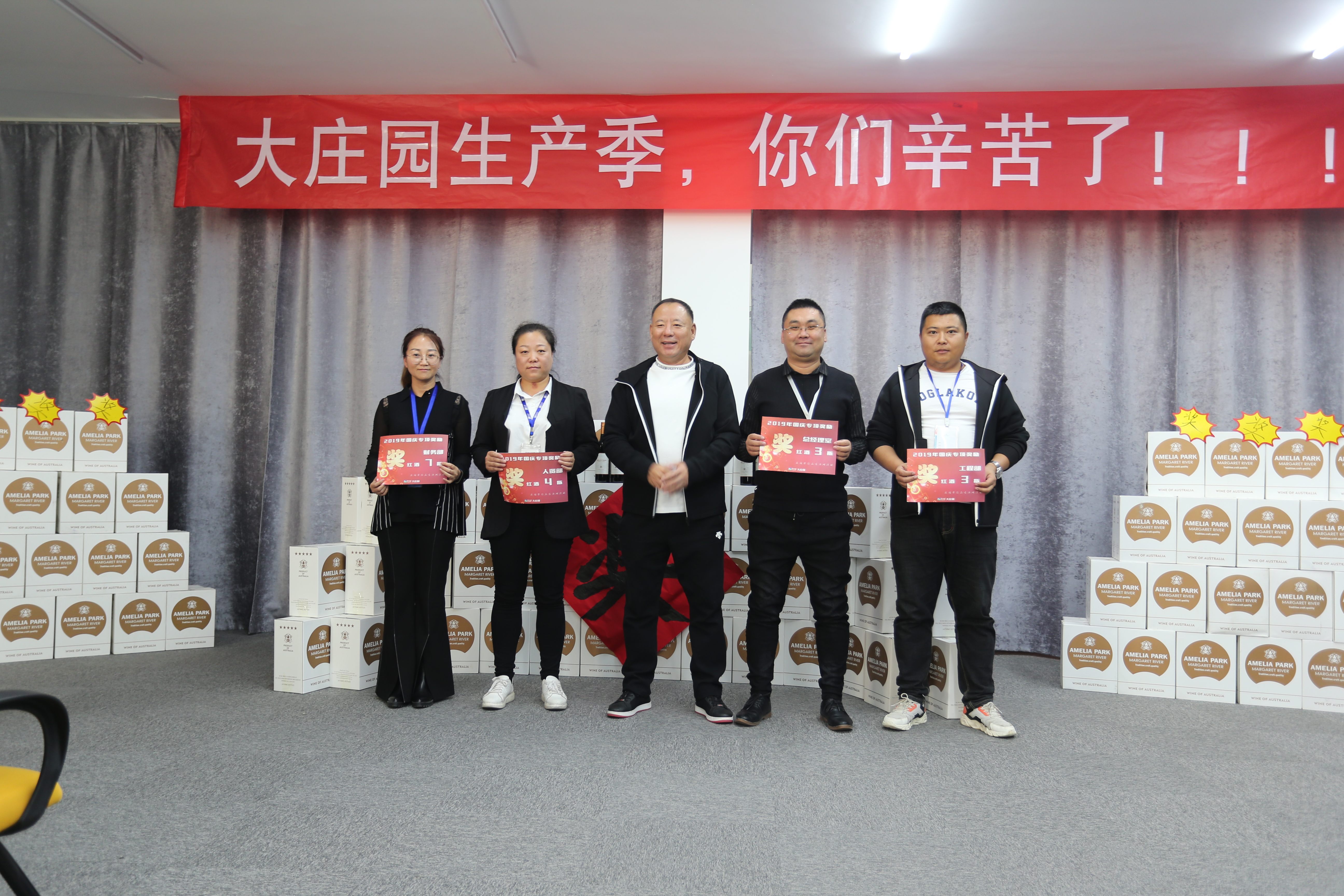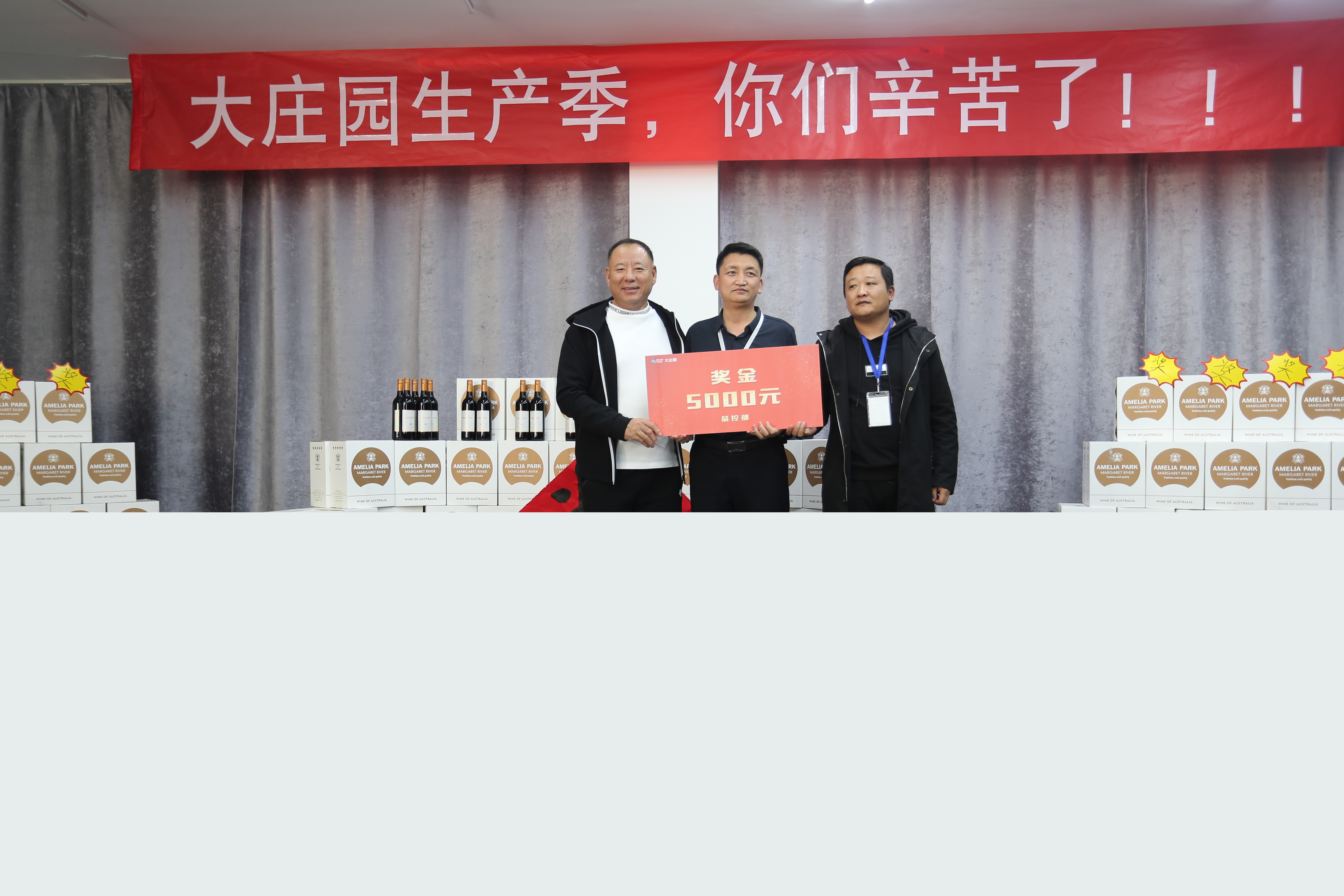 會(huì)場(chǎng)正中,高掛著“大莊園生產(chǎn)季,你們辛苦了!!!”的條幅,而紅酒墻上那個(gè)斗大的“獎(jiǎng)”字更是直接點(diǎn)出了這次大會(huì)的主題。