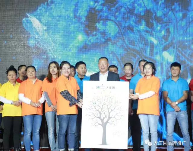 長3米5的35周年生日蛋糕推至臺前,它代表莊園35年的事業步步高升,蒸蒸日上。現場700余名員工集體合唱《生日歌》,并且大莊園全體員工為董事長準備了一棵由每一位莊園員工的指紋組成的莊園樹。“一棵樹,一家人”代表著所有莊園人在大莊園這棵大樹下吸取養分,茁壯成長。